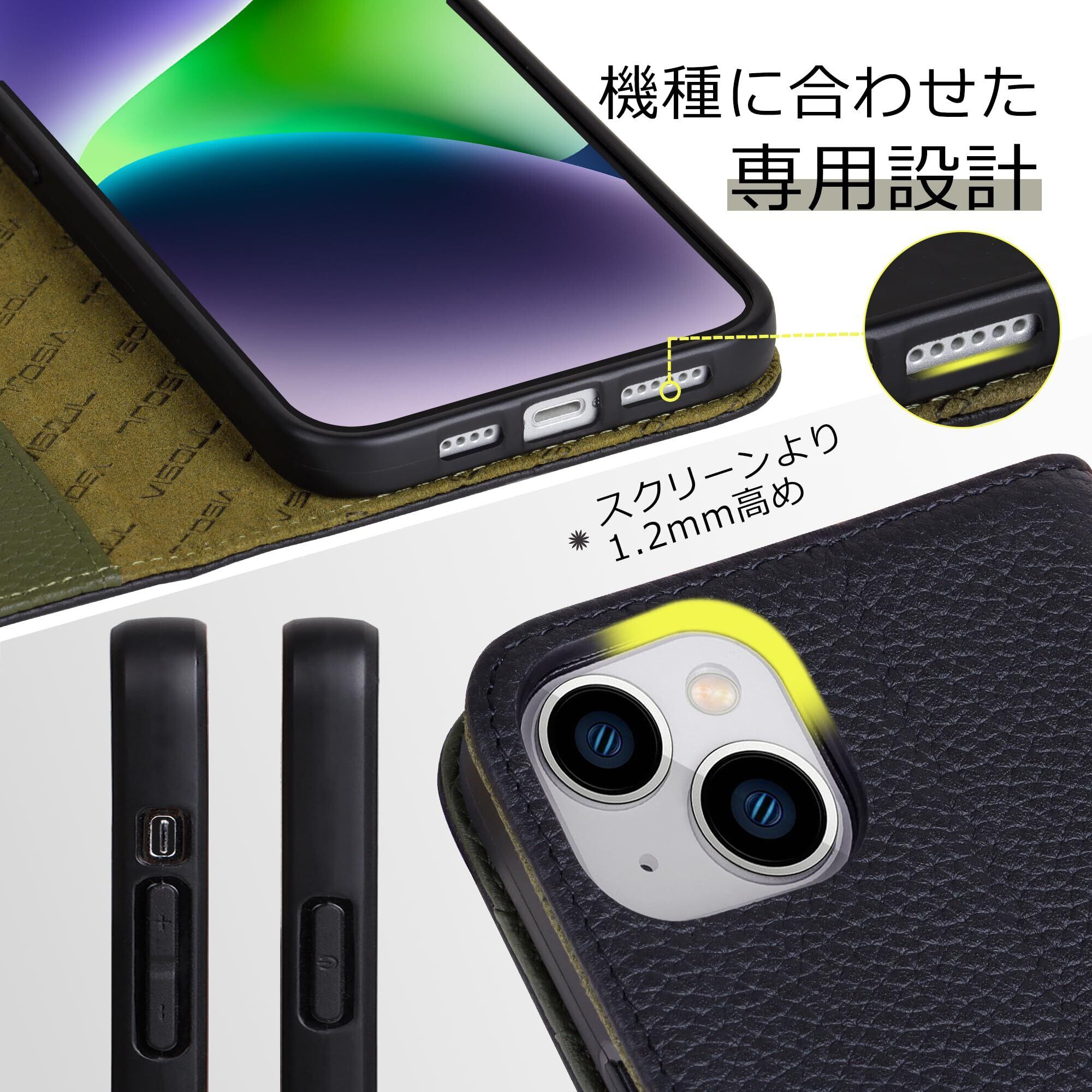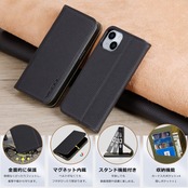 iPhone15 Plus対応・本革素材手帳型ケース:背面だけでなく、画面を覆っているため、画面から直接地面に落ちる場合は、スマホの画面を保護してくれるので安心といったイメージがあります。カバーの面積が広くなり、カバーの外側や内側を有効利用できる点も手帳型の魅力の1つでしょう。カバーの内側にポケットがあり、カード型のものを収納しておけます。定期やクレジットカードといったものは、生活する上で頻繁に使います。