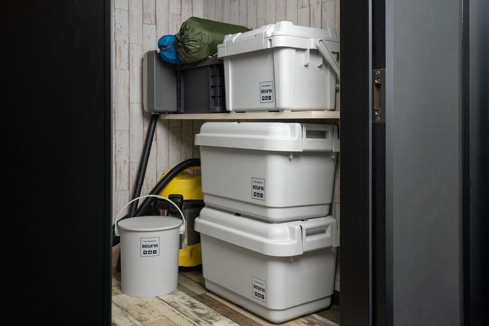 最低限必要な防災用品を収納しておき、サッと持って避難できるバケツです。ペットと一緒に避難する際にペット用品を収納するのにも最適です。フタをすれば簡易的なスツール・テーブルとして使用できます。