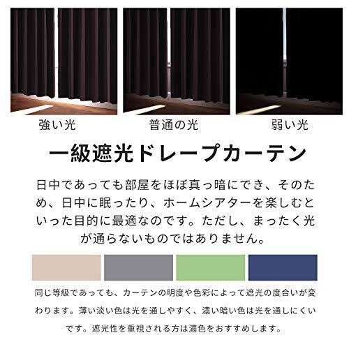 【一級遮光】このカーテンは遮光度が99.99%以上,外からの光をほとんど通さないため、昼間カーテンを閉めたお部屋のなかで相手の顔の表情が分からない程度にまでお部屋を暗くできます。同じ等級であっても、カーテンの明度や色彩によって遮光の度合いが変わります。薄い淡い色は光を通しやすく、濃い暗い色は光を通しにくいです。遮光性を重視される方は濃色をおすすめします。