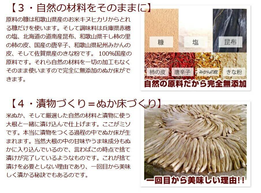 【無添加!自然材料をそのままに】原料の糠は和歌山県産のお米キヌヒカリからとれる糠だけを使います。そして調味料は兵庫県赤穂の塩、北海道の道南産昆布、 和歌山県干し柿の里の柿の皮、国産の唐辛子、和歌山県紀州みかんの皮、そして佐賀県産のきな粉です。 100%国産の原料です。それら自然の材料を一切の加工もなくそのまま使いますので完全に無添加のぬか床ができます。