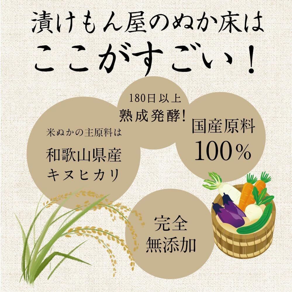 【誰でもカンタンに漬かるぬか床】ご家庭でぬか漬けを作ろうとすると本来はすごく手間がかかるものなのです。「野菜の捨て漬け」といってクズ野菜等を使って試し漬けをして、ぬか床を慣れさせなければなりません。しかしながら「漬けもん屋のぬか床」には捨て漬けは必要ありません。誰でもカンタンに一回目から美味しく漬けることができるのです。 【漬物屋ノウハウの集大成】長年ぬか漬けをつくってきた漬物屋「樽の味」が研究に研究を重ねて完成させたぬか 床です。漬物屋ならではの調味料の調合率、熟成の期間、温度管理等、ありとあらゆる 知識と技術を駆使して仕上げました。