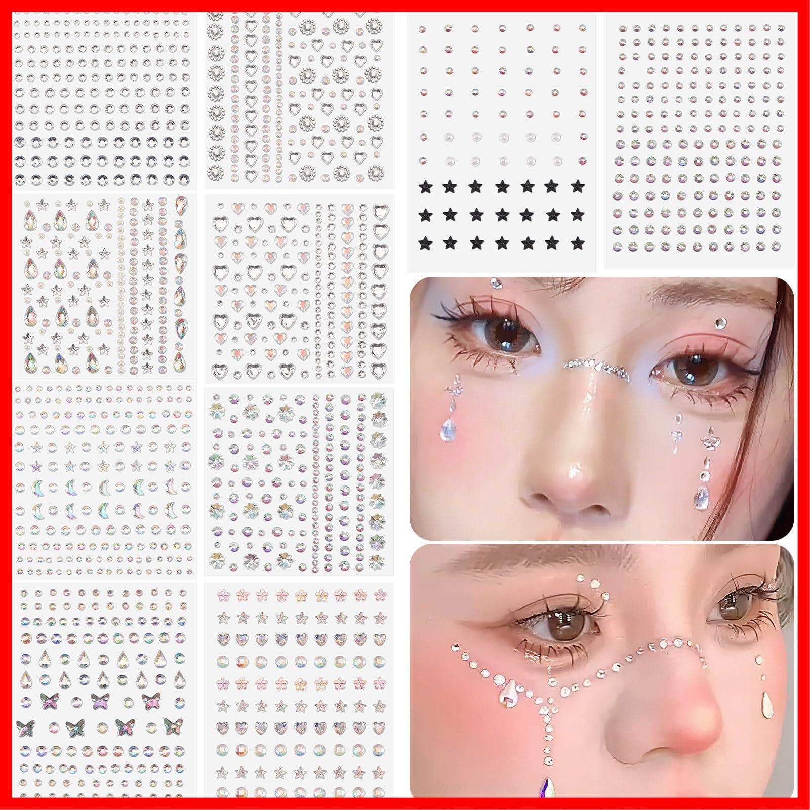 Neiang 顔 シール 10枚 ラインストーン シール フェイスシール キラキラ 顔に貼るシール ダンス ラインストーン 3Dシール デコシール 貼るピアス メイクシール デコパーツ 星 ハート 蝶 | ニコニコshops