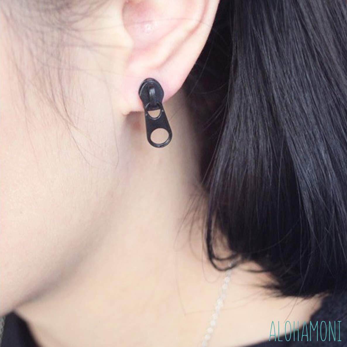 ALOHAMONI (アロハモニ) ファスナーピアス フェイク チャック ジッパー スタッド ピアス ヴィンテージ レトロ アンティーク 両耳 2個セット ステンレス シルバー レディース メンズ ユニセックス 韓国 オルチャン (ブラック) | ニコニコshops