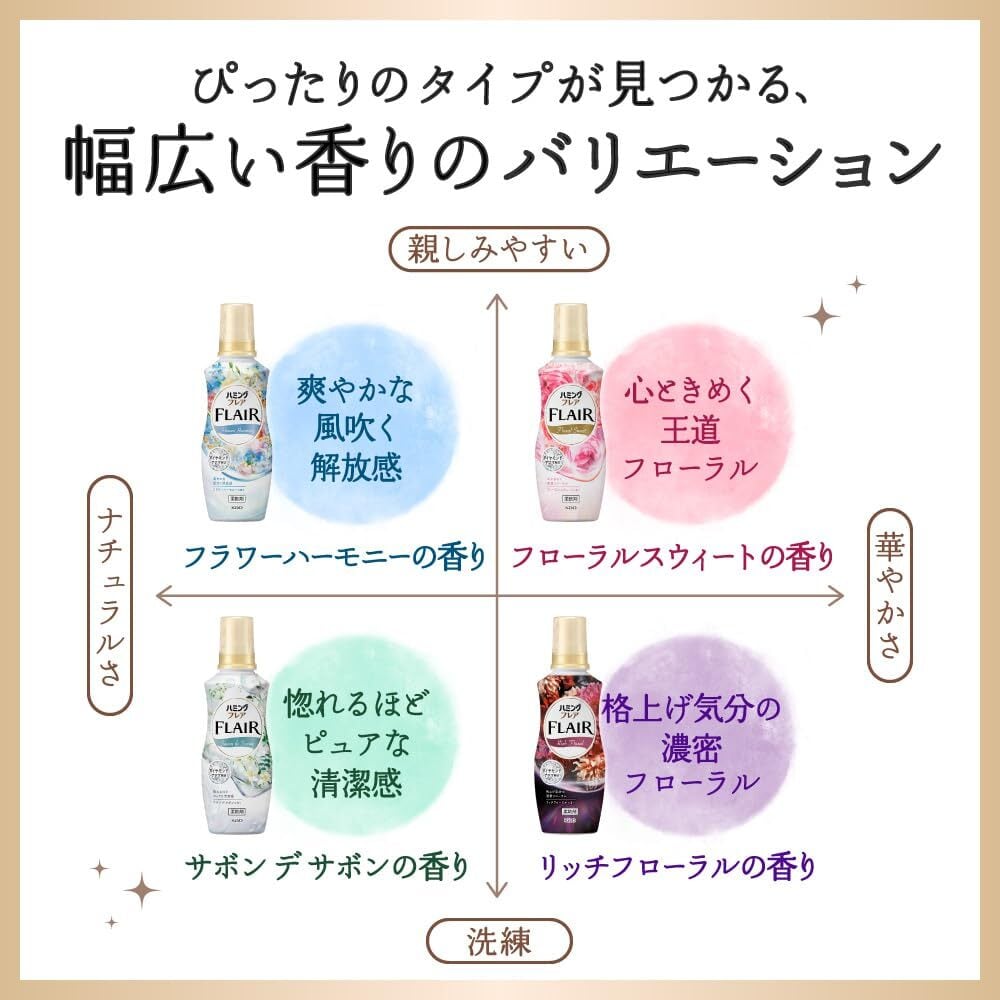 最高級*1アロマバランスで美しい香り続く、ダイヤモンドアロマ製法。華やかなフローラルにピーチのフレッシュな甘さと、バニラの温かみを加えた、心ときめくフローラルスウィートの香り。 ・香り12時間続く(服を着たとき・脱ぐとき、汗ばんだとき、タオルを使うとき) ・極上の肌ざわり*2 ・静電気を防ぐ ・洗たくジワを防ぐ ・抗菌*3・防臭効果 *1当社柔軟剤内 *2従来品比 *3すべての菌の増殖を抑制するわけではありません