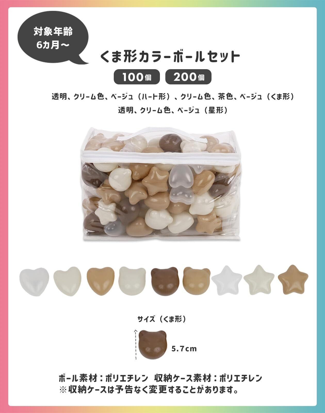 【赤ちゃんが安心して遊べるボール】くま形は直径5.7cm、ハート形・星形カラーボールは直径6cmなので赤ちゃんの小さな手でも握りやすい大きさです。また口に入れることができない大きさなので誤飲の心配がありません。なめても安心なポリエチレンを使用。柔らかいので体にボールが当たっても痛くありません。ボールをギュッと押してへこんでも元に戻ります。中国国家標準規格GB規格(中国版JIS)クリア済み。食品衛生法クリア済。フタル酸エステル、BPAは使用していません。