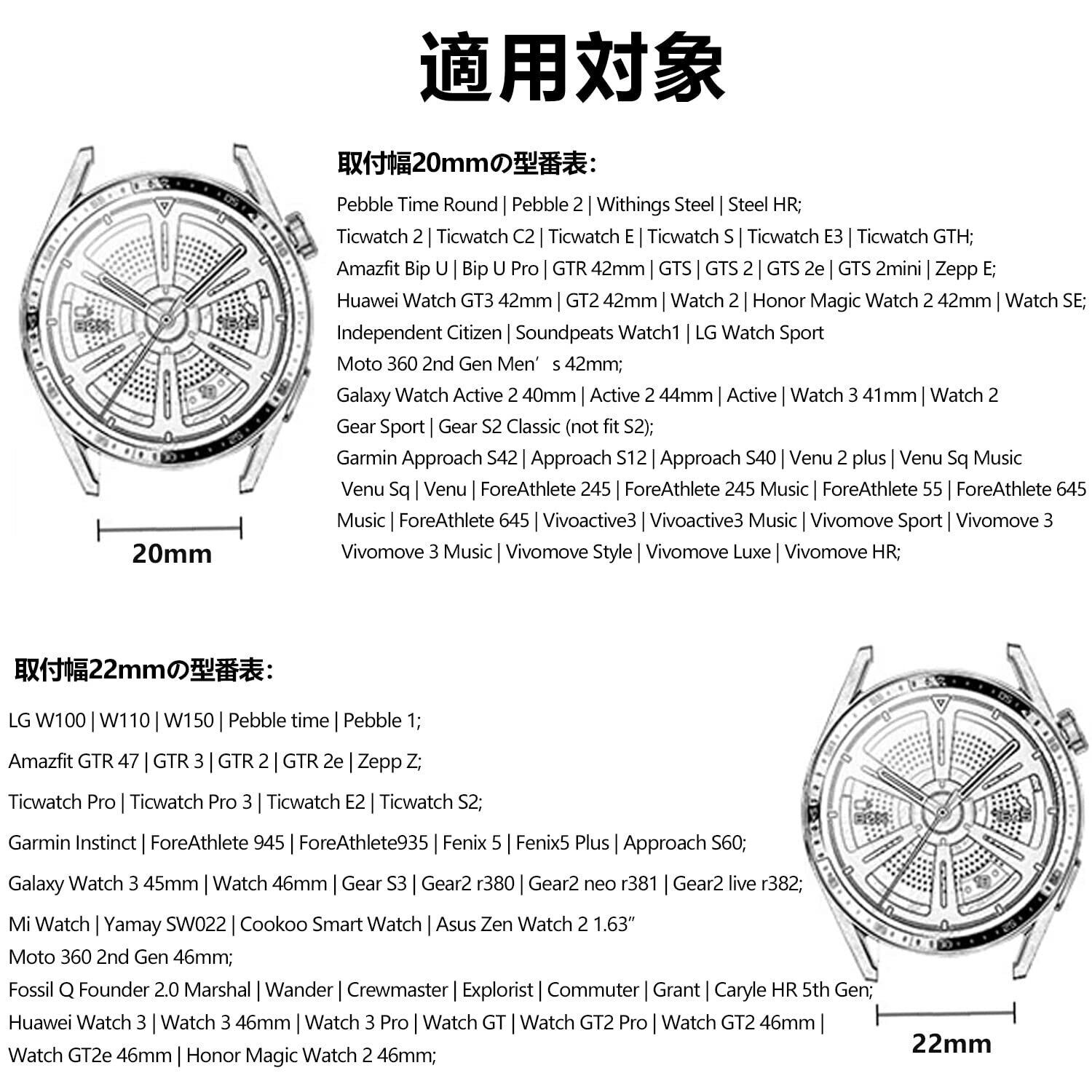 【対応モデル】:この時計バンドは幅20mm/22mmのバンドです、市販品のほとんどは全てのラグ幅が20mm/22mmのスマートウォッチやカジュアル腕時計に交換性があります。購入する前に必ず時計のラグ幅をご確認ください。
