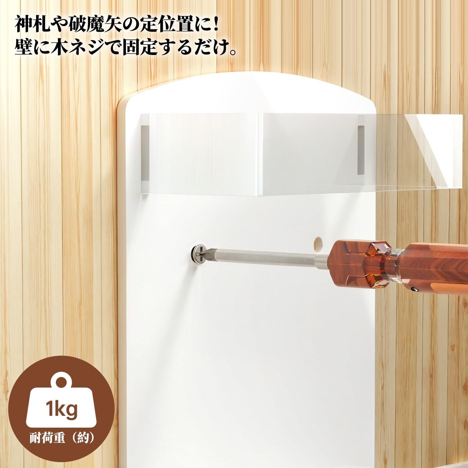 【設置可能な場所】木ネジで取り付け可能は壁:柱・かもい・板壁・プリント合板。石こうボード用プッシュピンで取り付け可能な壁:壁紙・布壁紙・ビニール壁紙貼りなどの石こうボード。寸法:長さ10×幅4×高さ12.8cm、内寸8.5×3.5cm。付属品は3本の石こうボード用プッシュピンと3本の木ネジです(神棚写真にイメージでお祀りの御札や御朱印帳などの付属はありません。)