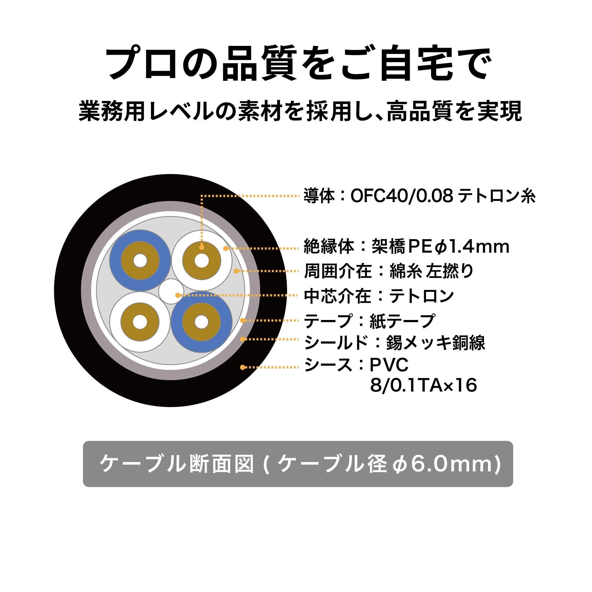業務用レベルの素材を採用し高品質を実現。プロ・業務用途で標準となる4 芯構造に加え、導体には無酸 素銅(OFC*)を、シールド線に は密度の高い編組構造、外来 ノイズに強い設計を採用。ご自 宅でもスタジオ同等の環境を 整えることができます。*OFC:Oxygen-Free Copper (高純度無酸素銅)99.99%純度の 無酸素銅