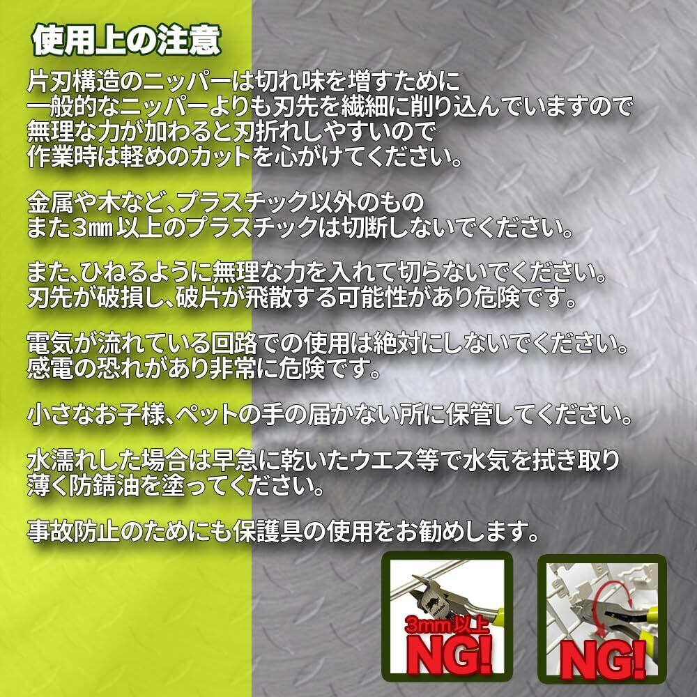 【片刃ニッパーまな刃について】 薄く研がれた切断刃の刃折れを防ぎ、スムーズに最後まで切るために 切断刃よりまな板刃がごく僅かに張り出した作りになっています。 不良などではなく商品の仕様であることをご理解ください ※切断刃を対象物に沿って切ることでほぼフラットに切ることが可能です