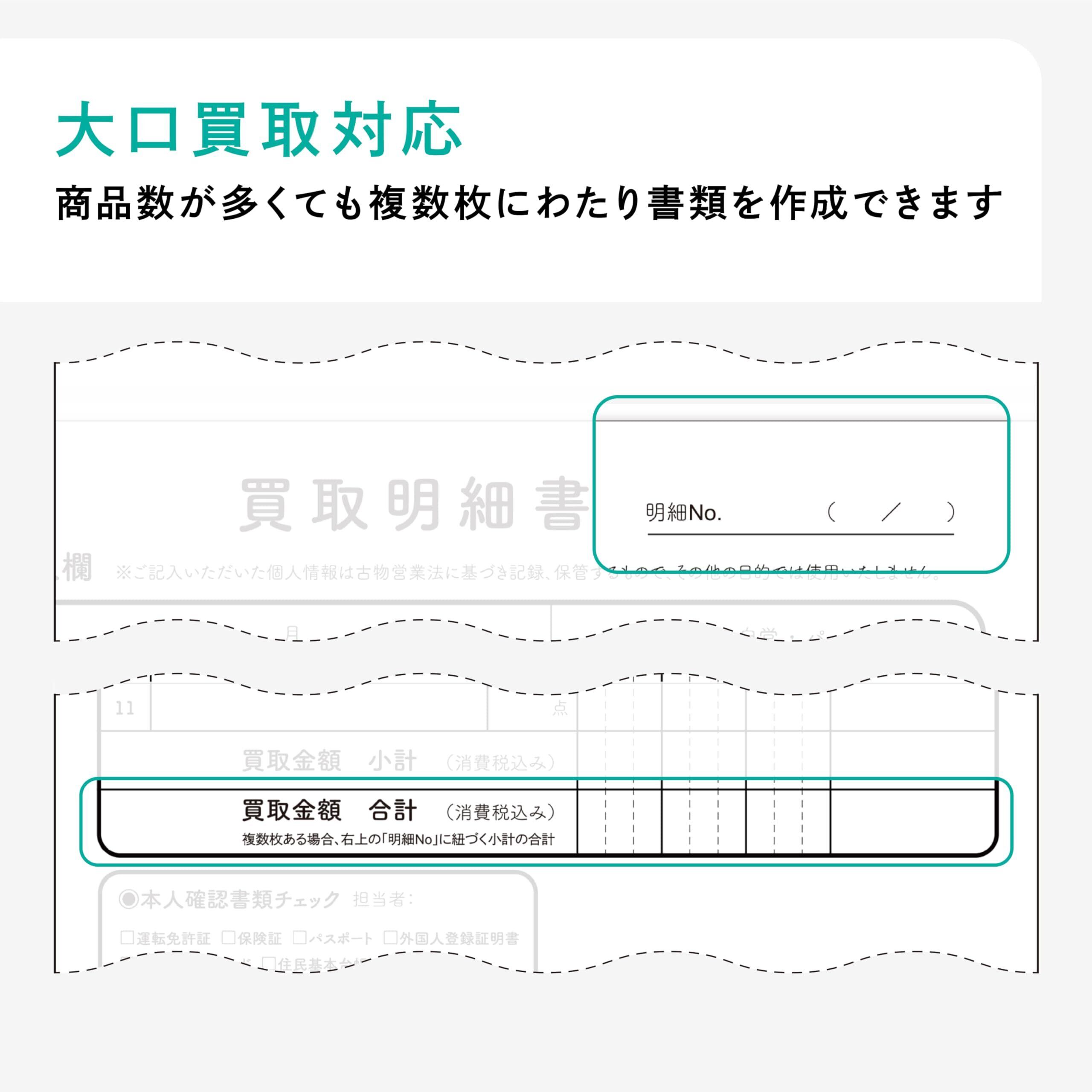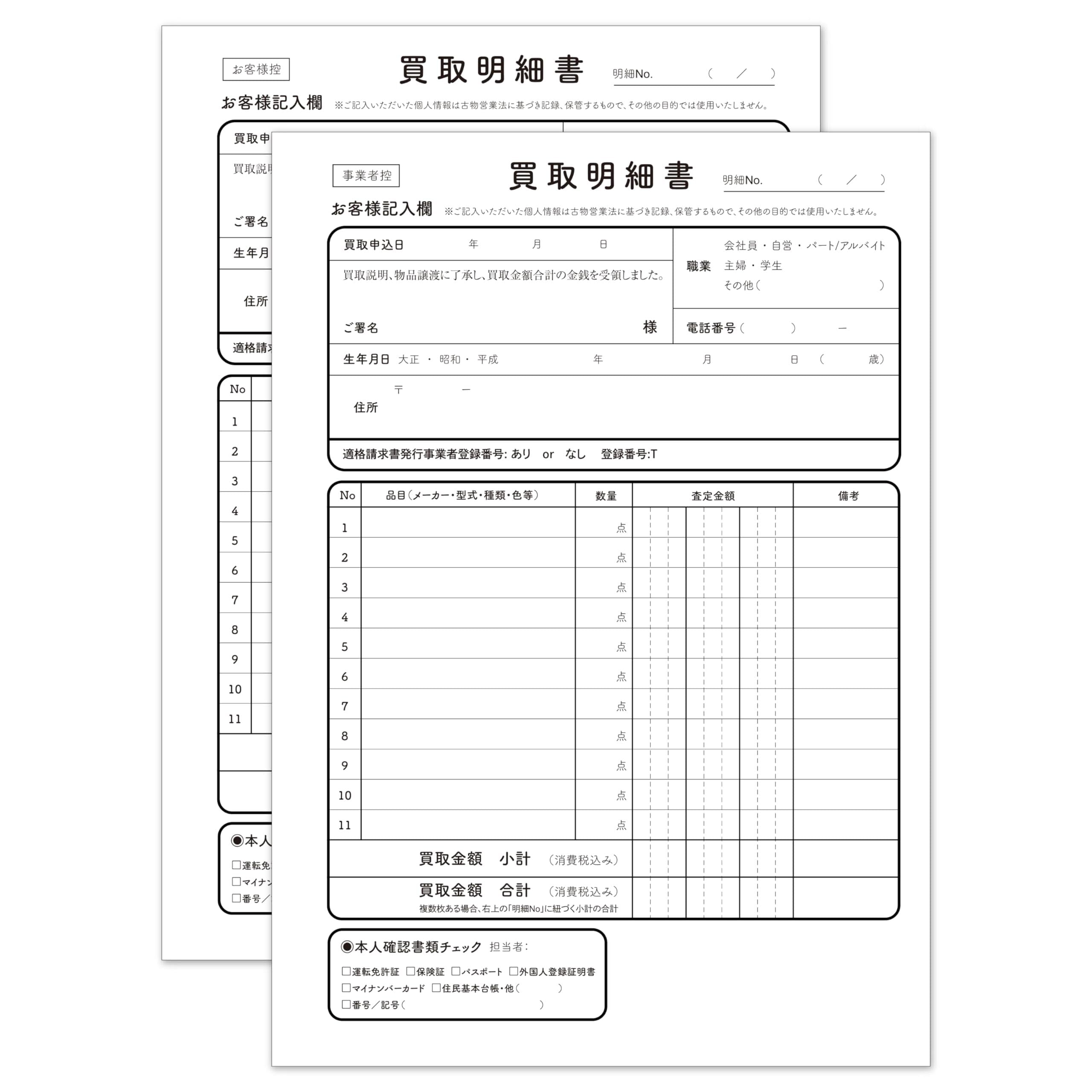 店頭買取用の伝票です。最新のインボイス方式に対応。複写式でお客様控えが簡単に作成できます。