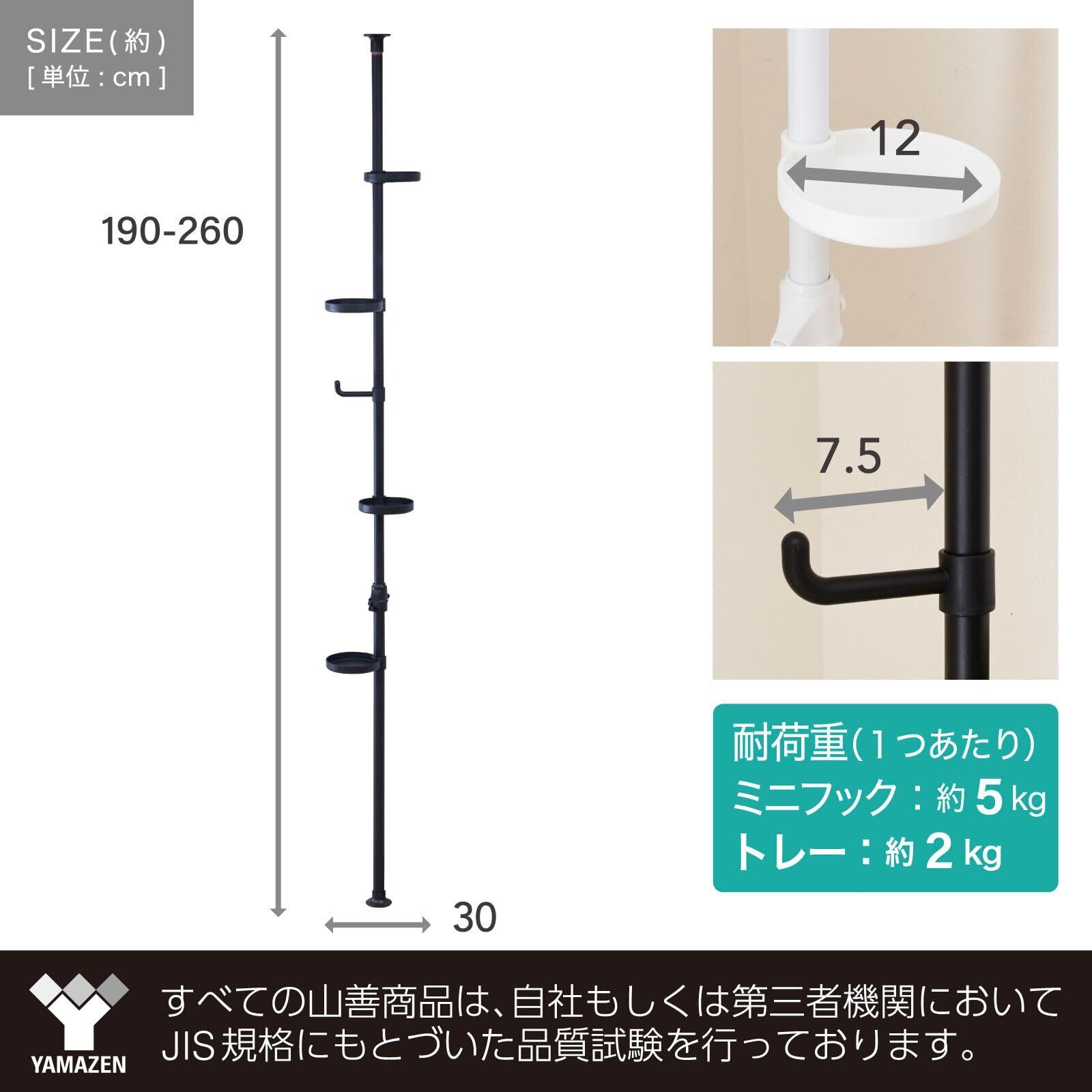 ●本体サイズ(約) : 幅30×奥行30×高さ190-260cm●丸トレーの内径 : 12cm●ミニフック直線部長さ : 7.5cm●全体耐荷重 : 約13kg(ミニフック1個あたりの耐荷重 : 約5kg、トレー1個あたりの耐荷重 : 約2kg)●材質:金属(スチール)、ポリプロピレン、ABS樹脂●表面加工 : エポキシ樹脂塗装●ミニフックの数 : 1個●トレー : 4個●東証プライム(株)山善で扱うすべての山善商品は、自社もしくは第三者機関において、JIS規格に基づいた品質試験を行っております。