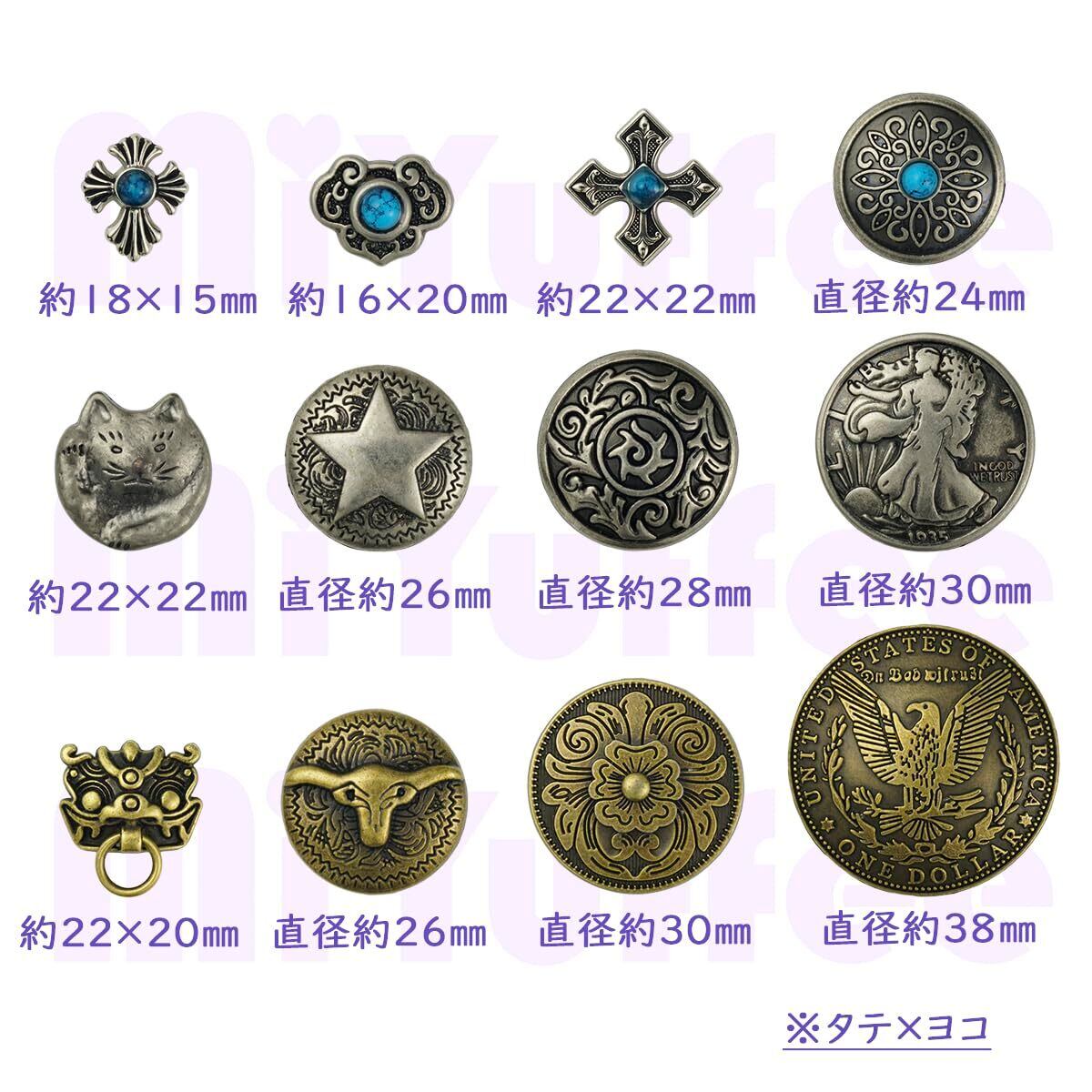 コンチョ ボタン 12個セット ねじ式 アンティーク シルバー 金古美 15mm~38mm ターコイズ 唐草 クロス フラワー レザークラフト 財布 手芸
