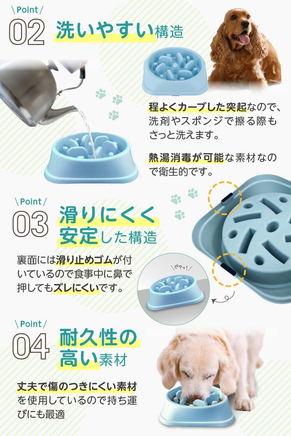 【獣医師監修】早食いを防ぐための突起はペットのストレスにならないよう計算された曲面形状で、低・中・高と3つの形の異なる形状がバランス良く配置されています。獣医師さんからも推薦の言葉をいただきました。