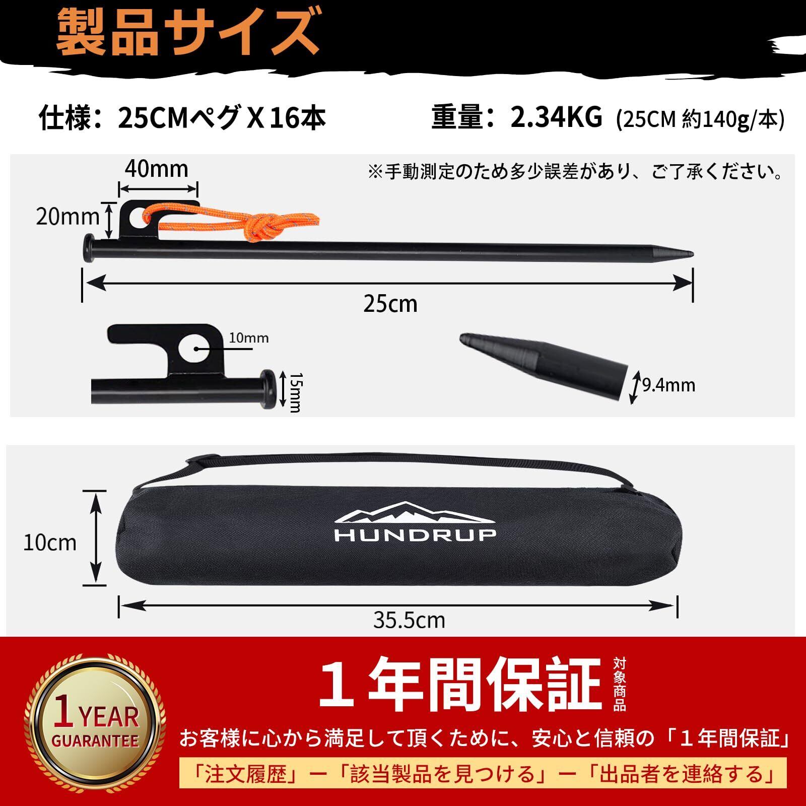 ◆【梱包内容・12ヶ月間安心】:梱包内容:25cmテントペグ*16本、900Dオックスフォード収納袋*1点。ペグサイズ:全長40cmx直経9.4mm。ご購入日より12ヶ月間安心がございます、万が一何ペグ打ち曲がり場合、錆びありの場合などがございましたら、ご遠慮なくご連絡くださいませ。至急新品交換・返金などのサービスを対応させていただきます。
