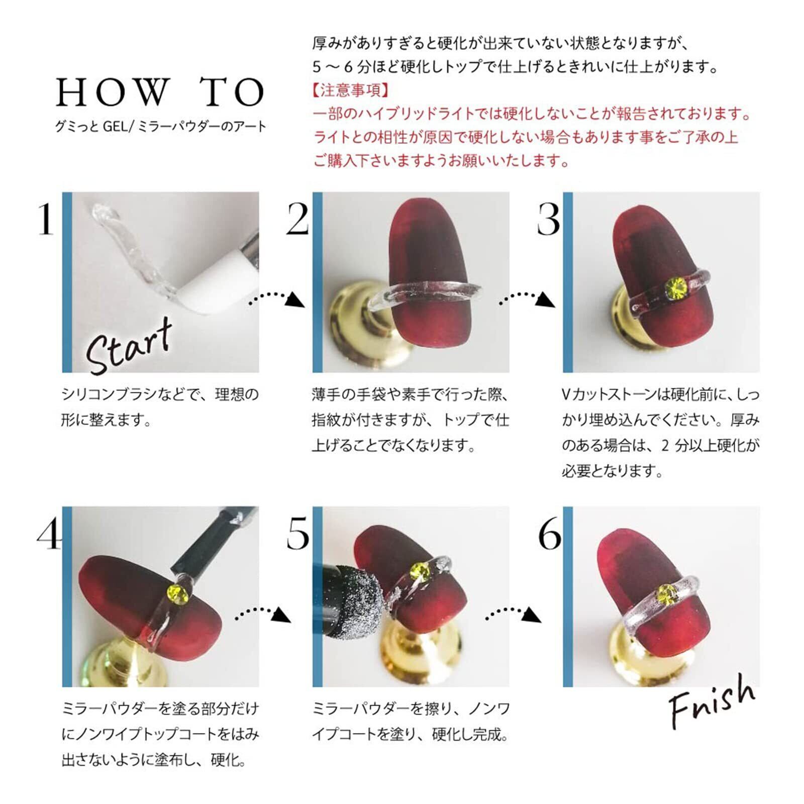 【ネイルチップ接着剤】ベースジェルの上に適量のグミッとジェルをのせ硬化するだけで強力にネイルチップを接着できます。熱いお湯でチップを外す事が可能なので、チップ側についたジェルを除去すればチップの使いまわしもできるので、デザインチェンジも容易にできます。