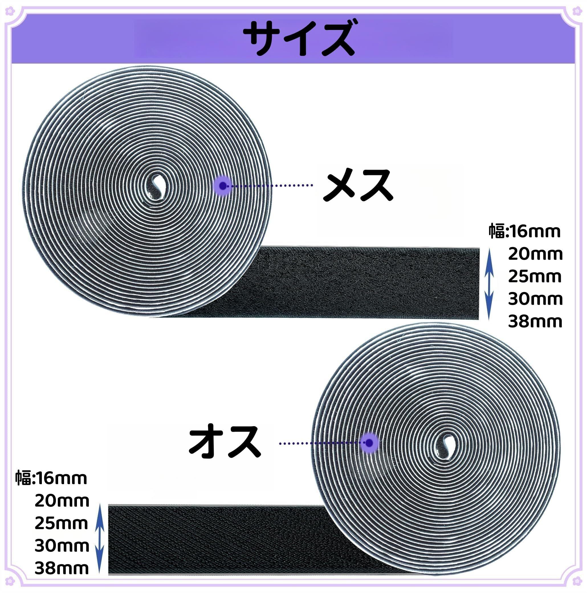 【商品仕様】パッケージ内容:強力面ファスナー オス1巻+強力面ファスナー メス 1巻、サイズ:幅38mm×長さ1m(オス・メス各1m)、カラー:ブラック