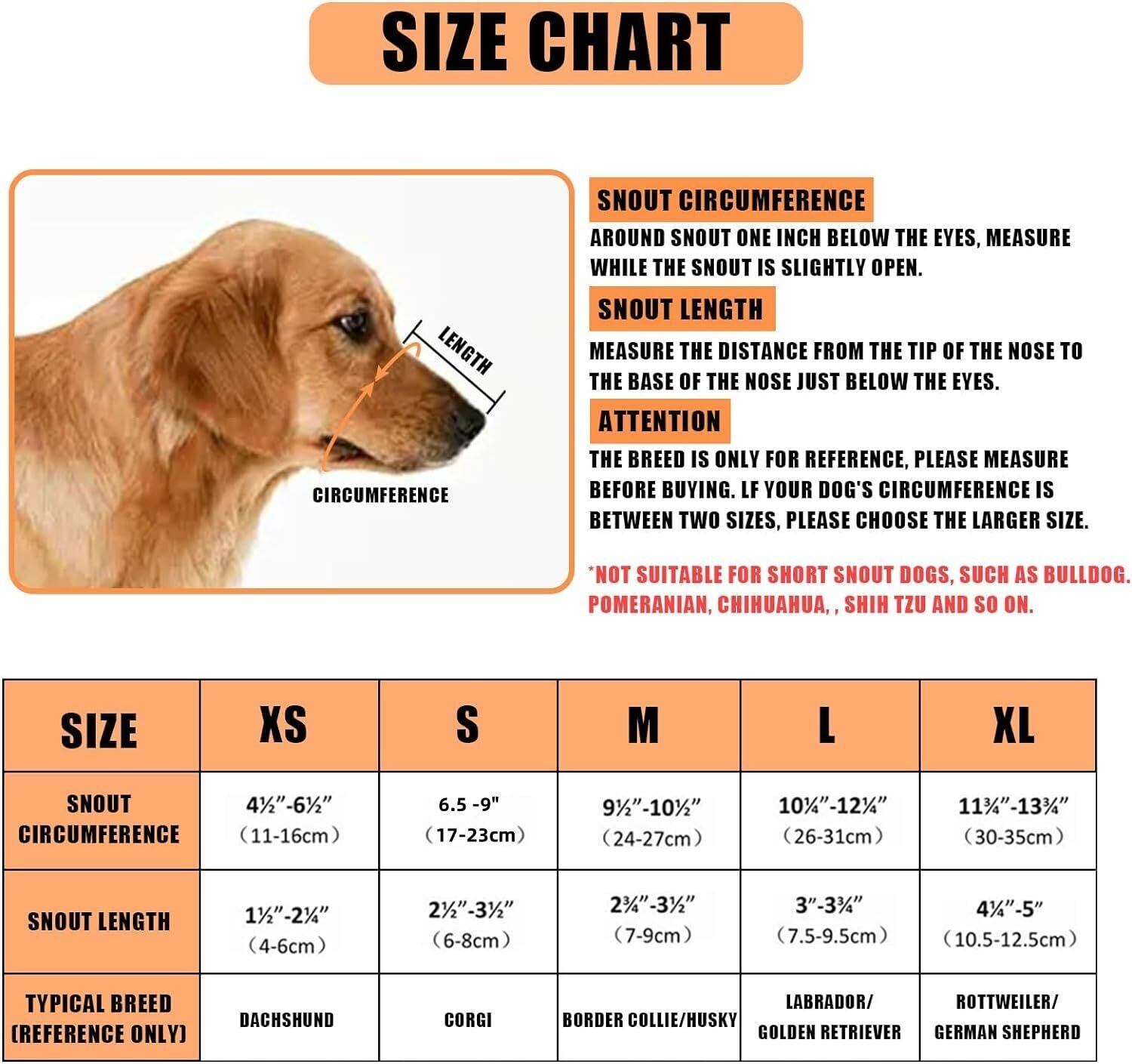 【サイズ】さまざまなサイズ、大型犬、中型犬、小型犬に適しています。XSサイズ:口周り11-16cm、鼻の長さ4-6cm。Sサイズ:口周り22~25cm、鼻の長さ6~8cm。Mサイズ:口周り24~27cm、鼻の長さ7~9cm。Lサイズ:口周り26~31cm、鼻の長さ7.5~9.5cm。XLサイズ:口周り30-35cm、鼻の長さ10.5-12.5cm。ブラックとグレーからお選びいただけます。