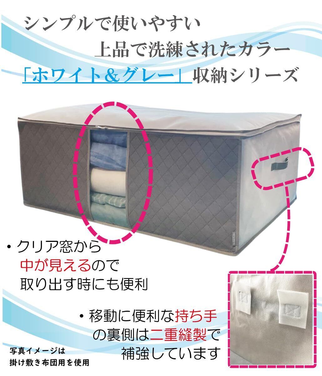 たっぷり5枚入り!衣類収納/整理ケース。衣類を畳んで入れるだけでスッキリ!通気性に優れた厚手の不織布(ふしょくふ)素材に活性炭シートを加工(前面部分)。上部ファスナーデザインで大きく開いて出し入れもしやすい。中身が見えるクリア窓/移動や持ち運びに便利な持ち手付き!洗練された上品なホワイトxグレー色のナチュラル収納シリーズです。