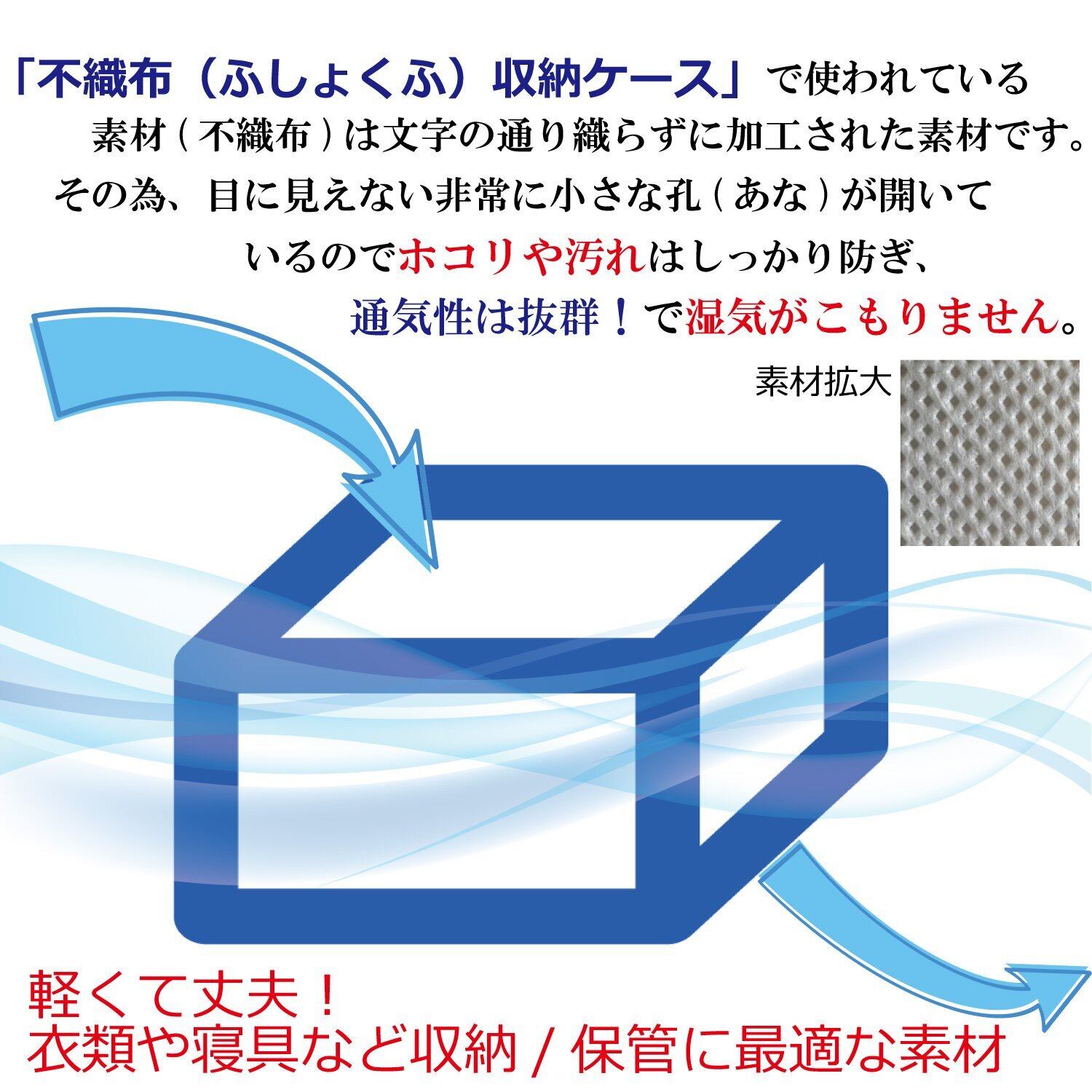 サイズ(収納ケース1枚あたり):約幅50x奥行35x高さ20cm 重量:100g 素材:ポリプロピレン不織布/ポリエチレン ※洗えません 生産国:中国