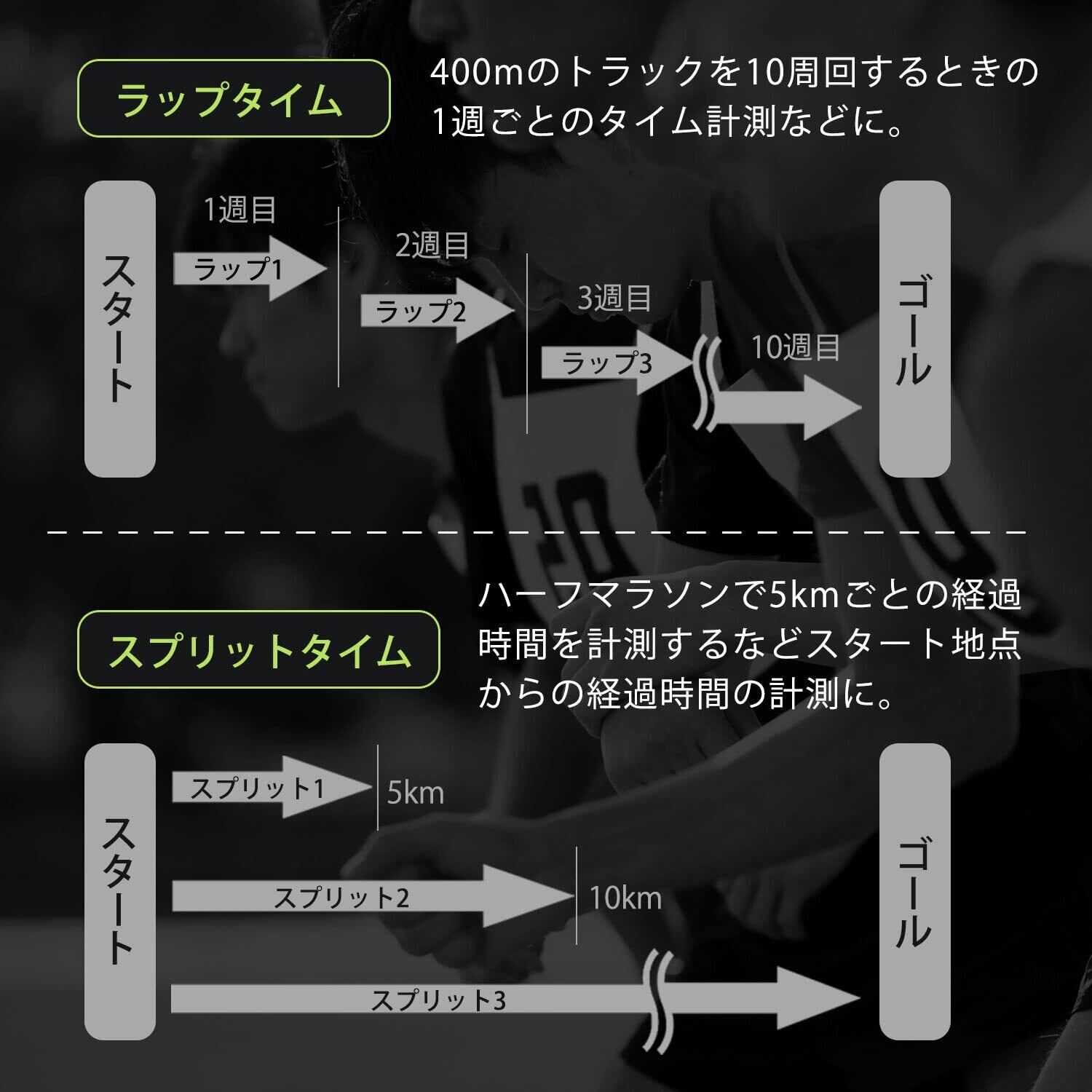 スポーツでの使用に適した1/100秒計測やスプリットタイム計測、ラップタイム計測が可能です。ラップタイムとスプリットタイムは100個まで記録を保存することが可能です。(100メモリー)
