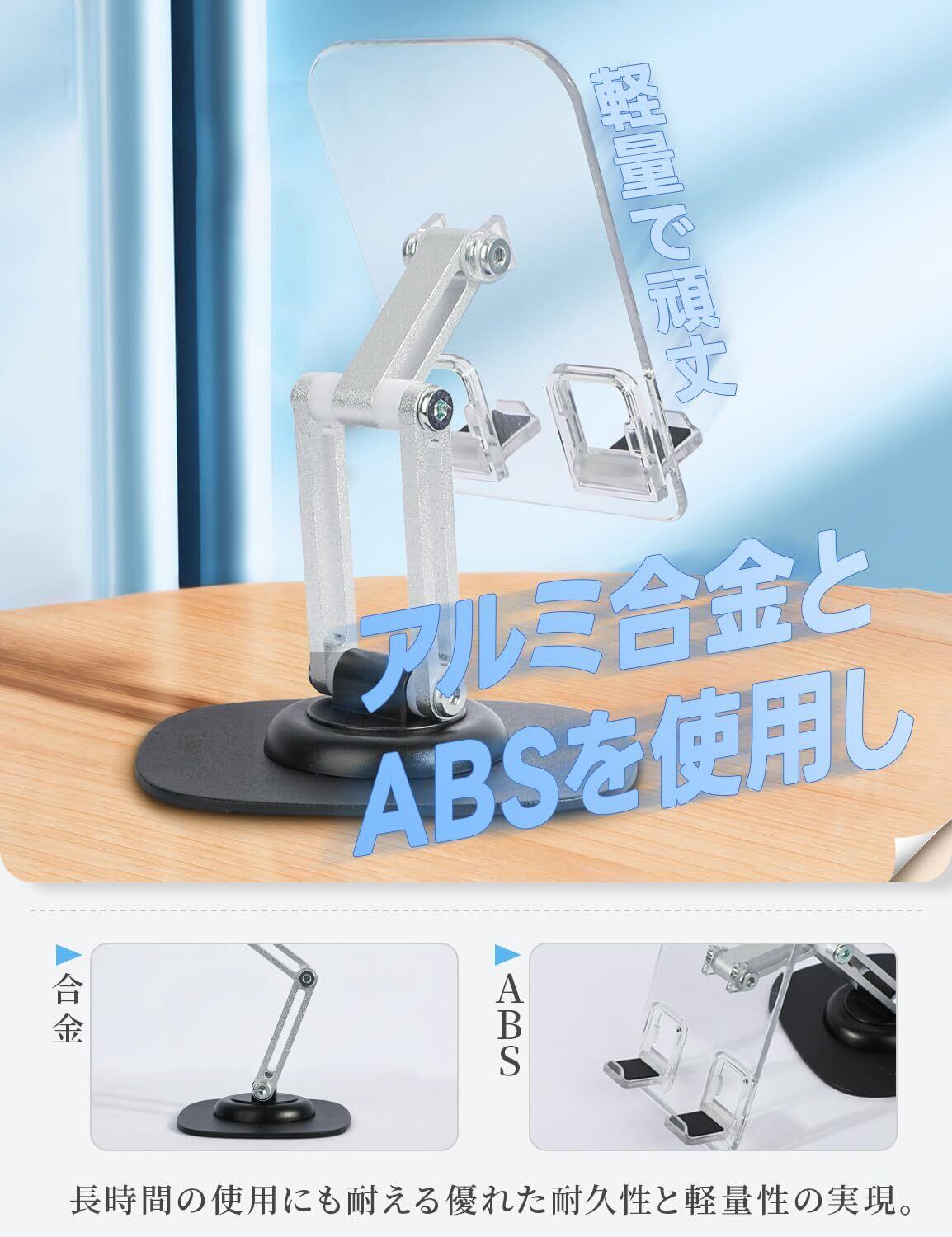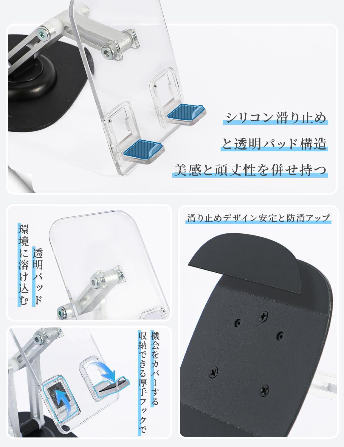 VIAKY スマホスタンド 360度回転 折りたたみ 携帯スタンド 卓上 3軸デザイン 角度·高さ調節自由 スマホ立て 収納便利 アルミ合金製ホルダー 折り畳み式 滑り止め付き 軽量 置き台 縦/横置き スマホ·タブレット スタンド (透明) | ニコニコshops