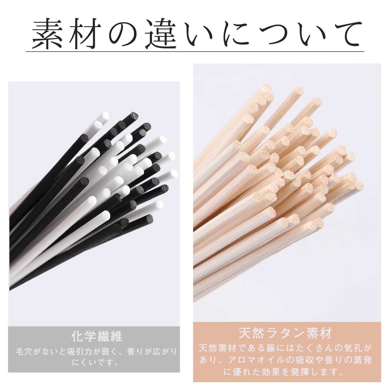 【香りが広がりやすい】ディフューザースティックは天然素材のラタンを採用しています。スティックは細かい穴がたくさんがあり、繊維素材より吸い上げる力が高く、香りがしっかり広がります。