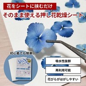シートに関して:そのまま使える押し花乾燥シートには乾燥剤成分は含まれておりません。代わりに紙自体に高い吸水性と剥離性を備えており、再利用も可能な構造で製造しております。その構造のおかげで一般的な乾燥シートと異なり、クッションシートを使用せず簡単に押し花を作成することが可能です。
