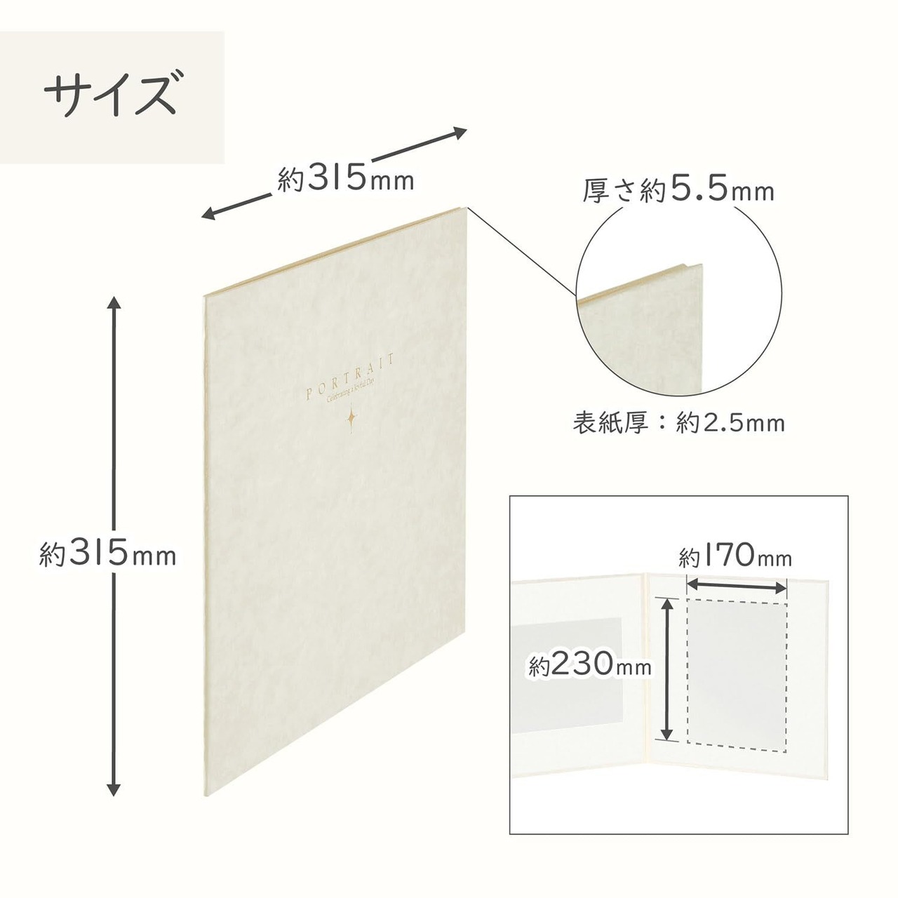 ■仕様 : 二つ折り、タテヨコ兼用■対応写真サイズ:6切サイズ(W203×H254mm)2枚用■表紙厚:約2.5mm■外寸法:約W315×H315×D5.5mm■中額中抜き寸法:約W170×H230mm