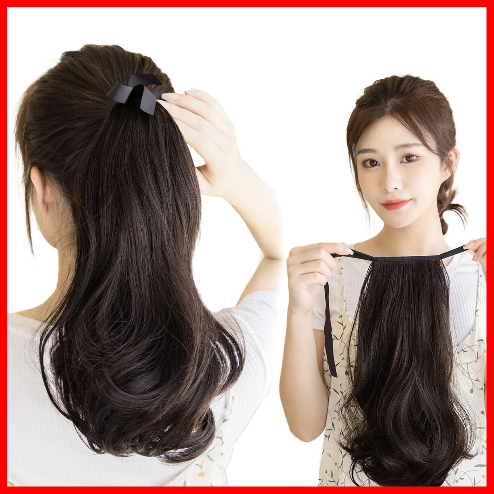 BARSDAR エクステ ポニーテール ウィッグ つけ毛 カール ロング ポイントウィッグ リボン 自然 長さ 35cm 40cm コスプレ 3色選び(ブラック×40cm)