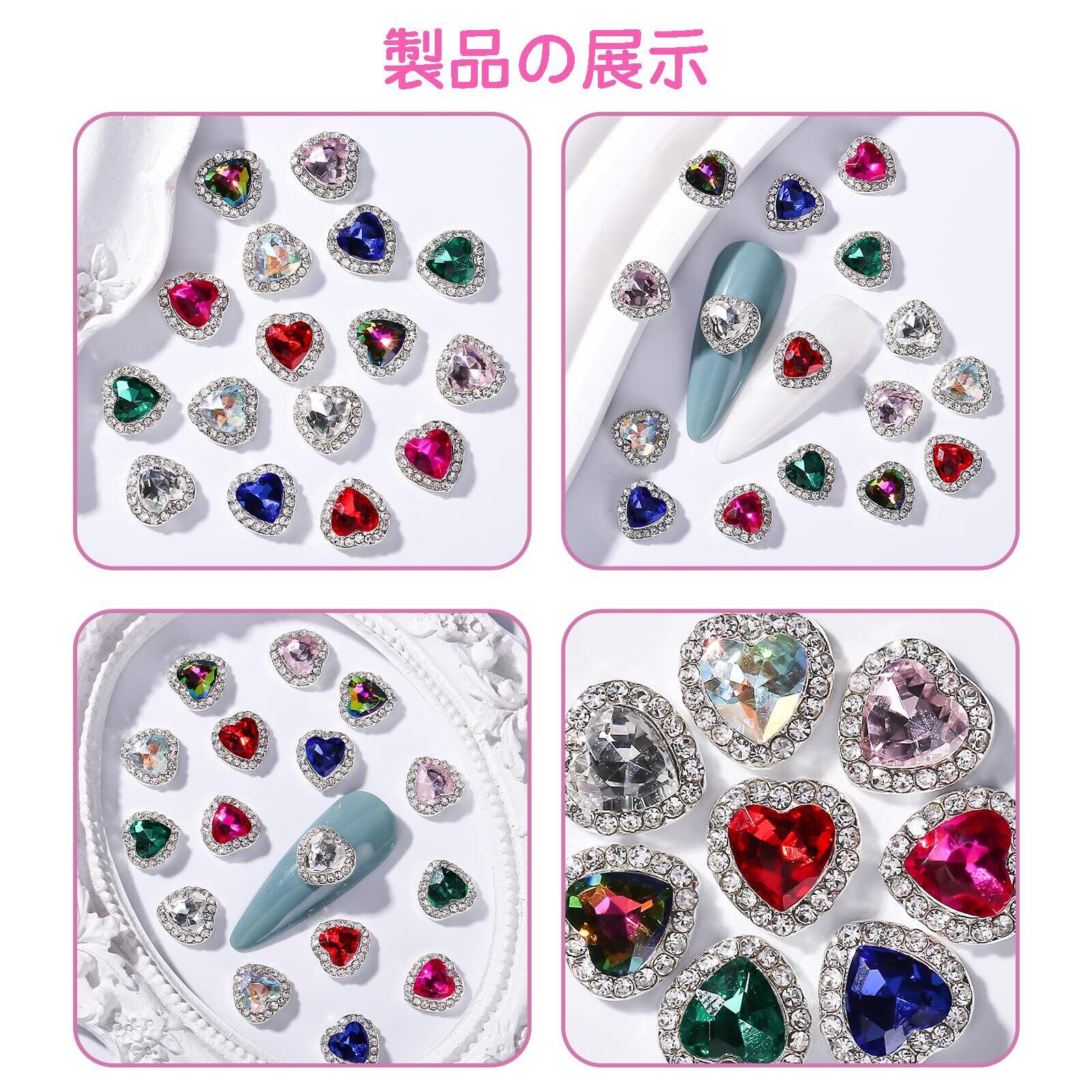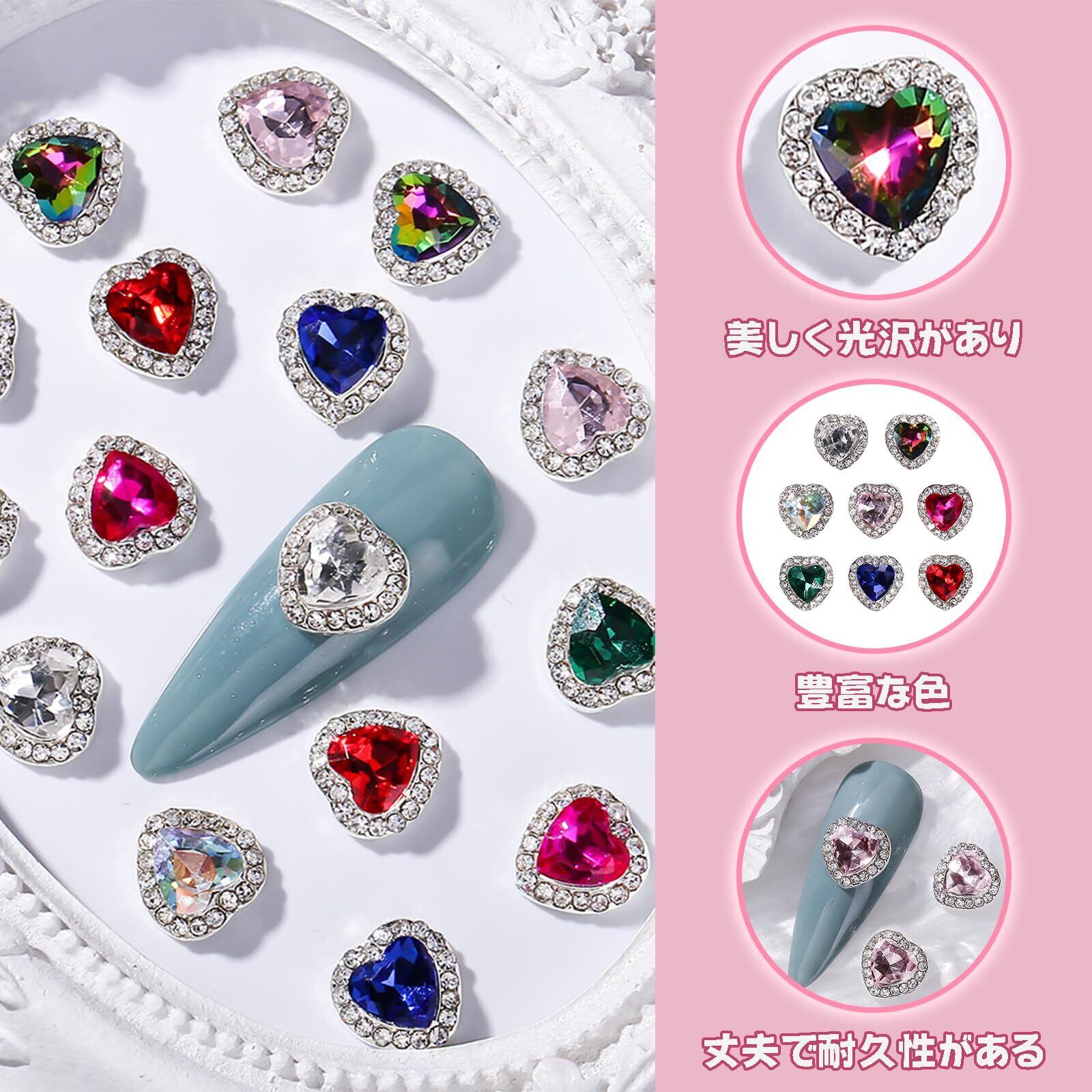 【ネイルパーツ ハート】ネイルパーツ ハートは、明るいストーンとクリスタルをはめ込んでいるネイルパーツはとても綺麗です。高級感があって美しい輝きを放ちます、ご指先をキラキラと輝いています。立体感があり存在感が抜群です、あなたの個性を表現し。ビジューネイルなど、立体的なネイルアートに最適です。